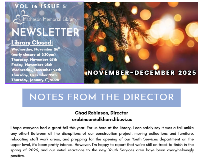 The November/December Newsletter is NOW Available! See what’s going on this winter at Matheson Memorial Library right HERE! admin2025-11-06T15:53:01-06:00 Share This Story, Choose Your Platform! FacebookXRedditLinkedInTumblrPinterestVkEmail Leave A Comment Cancel replyComment Δ This site uses Akismet to reduce spam. Learn how your comment data is processed.